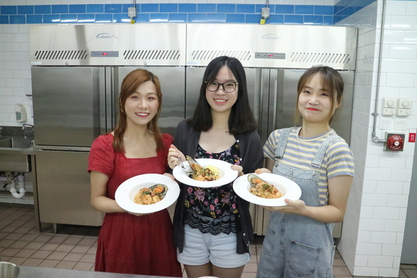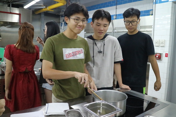 下午的课程由Mr.Clarence Pan为同学们现场示范西班牙海鲜饭的制作和蔬菜冻汤和甜品的摆盘。对于大多数第一次体验厨房的同学而言,可谓是既兴奋又忐忑。