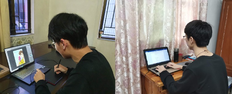 获奖同学叶振义正在创作参赛作品《带着爱》 获奖同学梁景豪正在创作广告文案