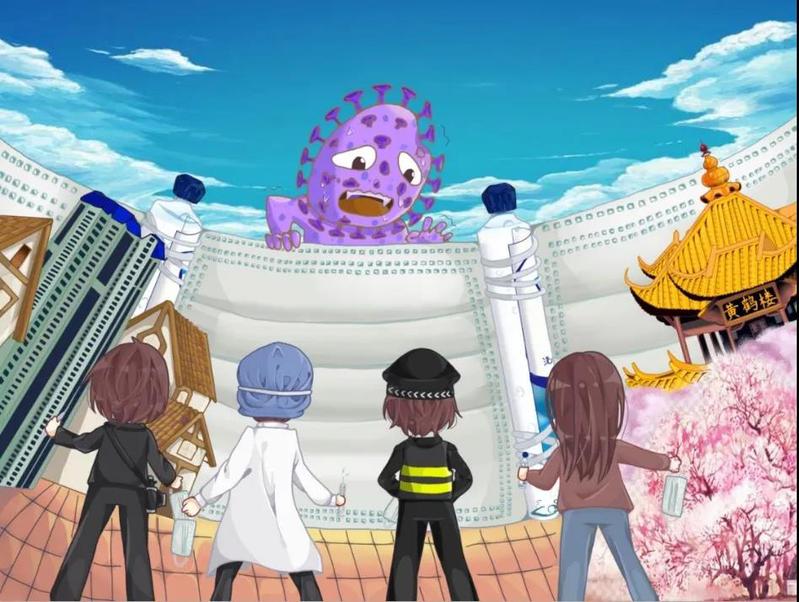 19级广告学李杭芷作品名称《众志成城 共克时难》。巨大的围墙由口罩和洗手液构成,呼吁戴口罩和勤洗手。图中四个人从左到右分别是媒体人、医生、军警、普通人——即无论是在疫区奔走,为我们提供关于疫情的最新消息的媒体人;还是在无私奉献,冒着生命危险为病人医治的前线医生;还是在各个路口站点、高铁站口等地检查、守卫的军警;亦或是自觉在家,尽量减少外出、会友的普通人,都有着同样高昂的斗志战胜病毒,体现了“众志成城 共克时难”的主题。
