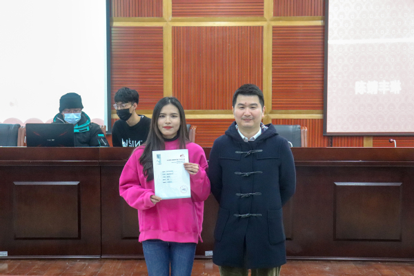 紧接着进入到颁奖环节。获二等奖的同学简梅芳、李杭芷上台分享作品和心得;获三等奖的张雄辉、郑舒瑶等四名同学与老师合影留念。