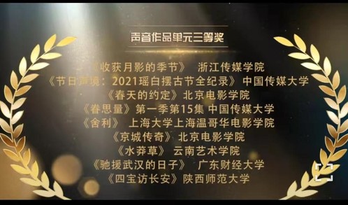年会当晚,中国高校影视学会2020-2021年度学术成果、影视作品推优活动暨第十四届“学会奖”、第十届“学院奖”在云端揭晓。我院师生作品共摘得1个二等奖、3个三等奖。包括贾毅教授、张乐副教授主持完成的《佛山市促进影视产业发展专项资金可行性研究报告》获调研报告组三等奖,我院为三水量身打造的首部文旅宣传片《寻境三水》获得短视频单元教师组二等奖,广播剧《驰援武汉的日子》获教师组声音单元三等奖,19级数字媒体艺术专业学生冯洁莹、吴梦瑶、李家瑜、欧晓钰创作的《蒙娜珍珍——一叶子广告》获得学生组短视频三等奖。这是学院成立以来第一次多个作品参与中国高校影视学会“学会奖”“学院奖”的评选,表现亮眼。