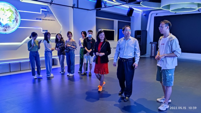 邹新月一行在同心楼恰逢湾区影视产业学院的师生们在实验室拍摄招生宣传片。研究生刘康同学自豪地向邹新月介绍了实验室目前居国内领先水平的4K摄像机、动作捕捉系统、影视后期工作站,他表示要珍惜目前先进的专业实践教学条件,积极践行学院“产教融合、产创融合、产研融合”的办学理念,用青年的热情和奋斗喜迎党的二十大胜利召开。