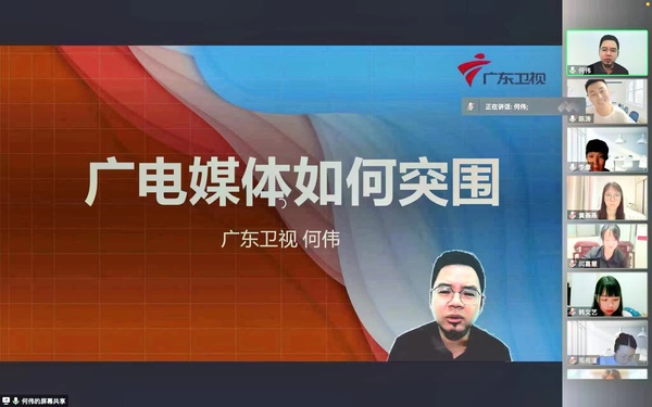 为了积极响应教育部关于进一步提高研究生培养质量的要求和学校关于研究生新生提前培养的工作部署,尤其突出学院“面向产业需求、服务产业发展”的人才培养特色,提升艺术硕士(广播电视)专业学位研究生对影视行业一线的认知水平,7月28日晚,湾区影视产业学院2022级研究生暑期提前培养活动之影视产业前沿系列讲座在线上通过腾讯会议隆重举行。广东卫视副总监何伟受邀担任首场讲座开讲嘉宾,以“广电媒体的现状与突围之路”为主题,全景式展现了当前传统广播电视媒体的守正创新举措,我院研究生及青年教师70余人参与学习和互动交流。