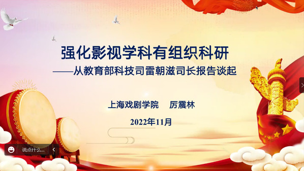 2022年11月15日晚,湾区影视产业学院邀请上海戏剧学院教授、博士生导师厉震林在腾讯会议平台开展了题为“强化影视学科有组织科研——从教育部科技司雷朝滋司长报告谈起”的线上讲座。本次讲座由院长贾毅教授主持,我院教师及研究生参与了本次讲座。
