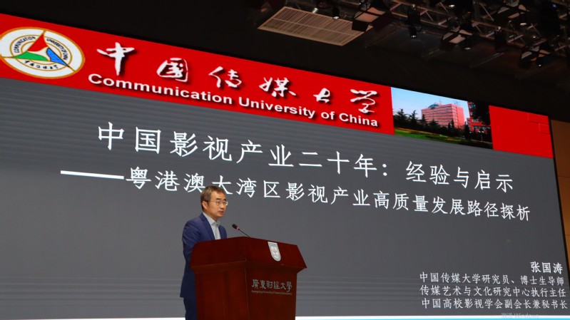 中国高校影视学会副会长、秘书长张国涛研究员代表中国高校影视学会致辞并发表题为《中国影视产业二十年:经验与启示——粤港澳大湾区影视产业高质量发展路径探析》的演讲。他援引数据梳理了中国影视产业自2002年以来二十年的斐然成就,并提出五个经验与道路,即:以人民为中心,把社会效益放在第一位;政策引导先行,推动产业提升造血能力;体制优化改革,提升民营经济主体地位;形成多元化动力模式,动态调节供需关系;主动实现主流价值创新传播,探索中国特色创作模式。他进一步建议,粤港澳大湾区影视产业高质量发展应该走精品化、特色化(区域化)、工业化、集约化、国际化路径,打造中国影视“南中心”。