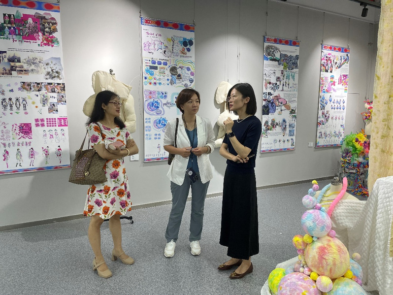 随后考察组一行参观了南京传媒学院国际学院的毕业作品展,陈莎莉书记与院长助理杨青老师探讨了国际化办学等问题。
