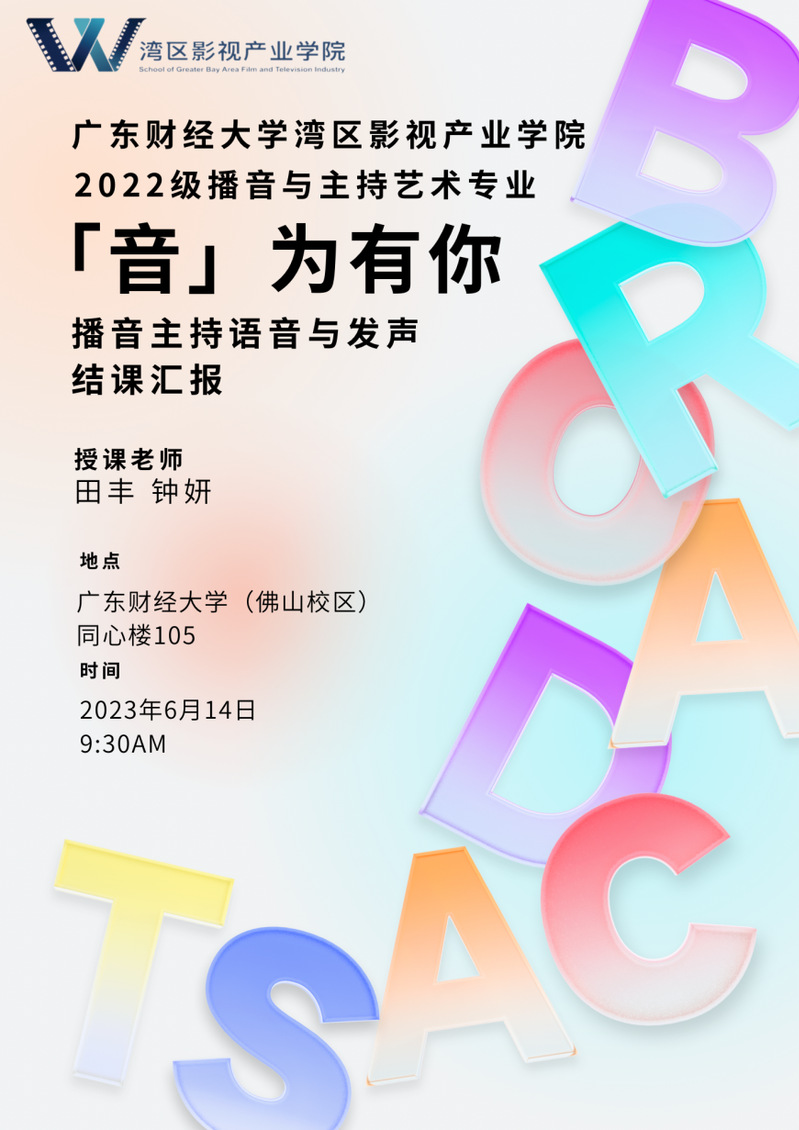 2023 614日上午,湾区影视产业学院22播音与主持艺术专业“播音主持语音与发声结课汇报在佛山校区同心楼105举行。