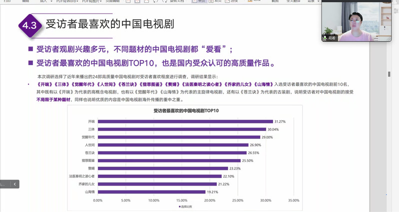 在讲座中,司若教授特别提到,这项关于中国电视剧海外传播影响力的研究是基于团队的一手调研数据,覆盖全球76个不同国家和地区的1482份有效受众样本,和国营影视机构、民营影视机构、长视频平台海外版、短视频平台海外版、国际互联网平台等多类电视剧海外传播平台,调研难度大,范围广,成果也更显价值。