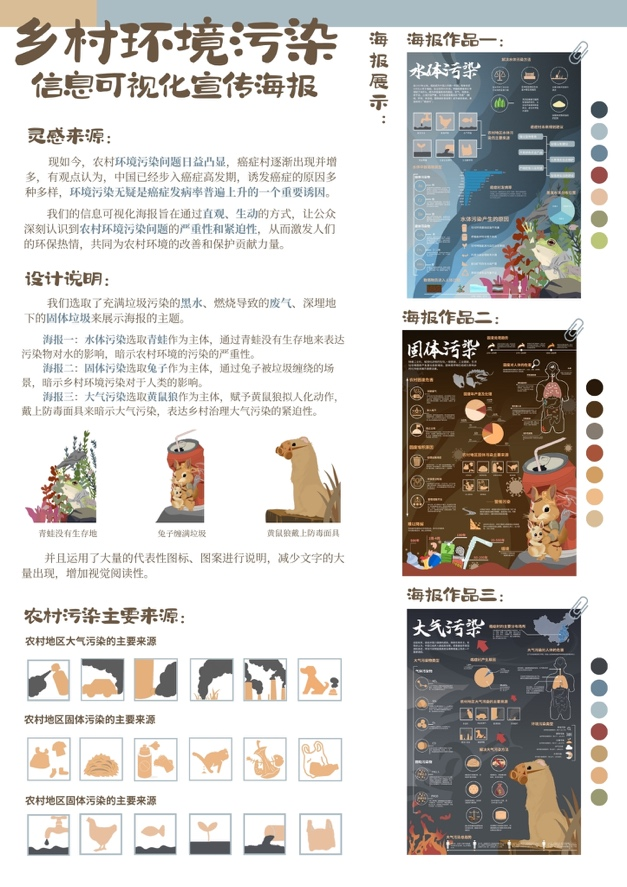 我们选取了充满垃圾污染的黑水、燃烧导致的废气、深埋地下的固体垃圾来展示环保主题,运用了大量的代表性图标进行说明,增加可读性。信息可视化海报旨在通过直观、生动的方式,让公众深刻认识到农村环境污染问题的严重性和紧迫性,从而激发人们的环保热情,共同为农村环境的改善和保护贡献力量。