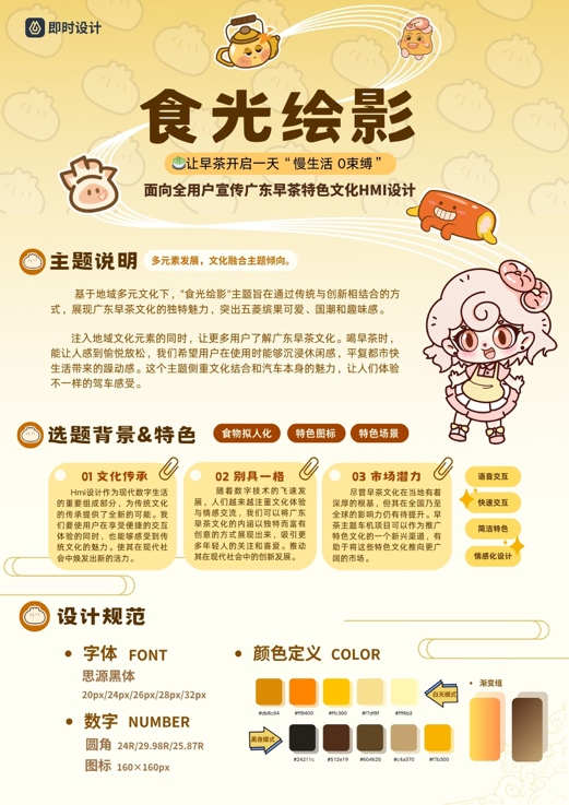 设计说明:我们以广东早茶文化为灵感进行“五菱缤果”车机主题设计。该作品采用典型的早茶符号,如精致的点心、茶壶纹样,以及温暖柔和的色调,营造出闲适雅致的氛围。同时,结合国潮设计风格,将车机界面的图标、动画和交互设计融入趣味与文化内涵,展现五菱缤果的可爱与活力。通过这一主题,我们希望让用户在每一次启动车辆时,都能仿佛置身于一场温馨的早茶时光,感受广东传统文化的魅力与现代生活的轻松愉悦。