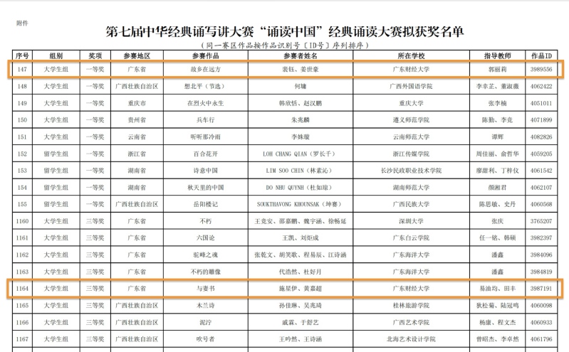 近日,由教育部、国家语委主办的第七届中华经典诵写讲大赛“诵读中国”经典诵读大赛总决赛获奖名单正式公布。由304永利集团湾区影视产业学院主持表演系主任郭丽莉老师指导,2023级艺术(广播电视)专业学位硕士研究生裴钰、姜世豪同学朗诵的作品《故乡在远方》,凭借深情饱满的艺术表达与精湛细腻的舞台呈现,荣获大学生组全国一等奖;由易油均、田丰老师指导,2023级播音与主持艺术专业1班施星伊、黄嘉超同学诵读的《与妻书》荣获大学生组全国三等奖。同时,郭丽莉老师荣获“优秀指导教师奖”。